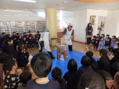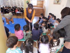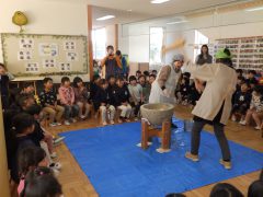 みどり組さんが一人ずつ餅つきに挑戦し、もも・あか組の子ども達は全力で応援します。